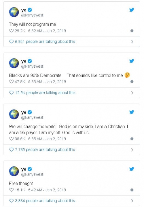 그 후 그는 '흑인의 90%가 민주당원이라는 것은 '통제'처럼 들린다', '우리는 세계를 바꿀 것이다. 신은 내 편이다.'라는 일련의 트윗을 올렸다.