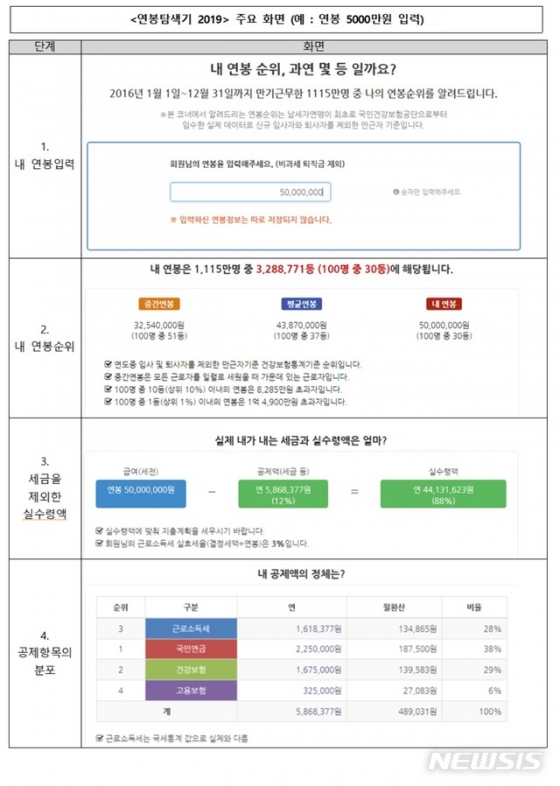 '연봉탐색기 2019'는 연봉순위 이외에 자신이 실제로 내는 세금과 실수령액, 절세비율, 연봉에 맞는 각종 세테크팁까지 제공해준다.