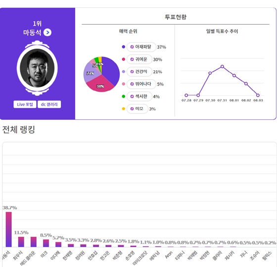 해당 스타들 가운데 총 4174표 중 1617표(38.7%)로 배우 마동석이 1위에 올랐다. 마동석은 1989년 가족과 함께 미국으로 이민을 가 미국 시민권을 획득했다. 최근 마블 영화 '이터널즈'에 캐스팅되면서 해당 사실이 다시 한 번 화제가 된 바 있다.
