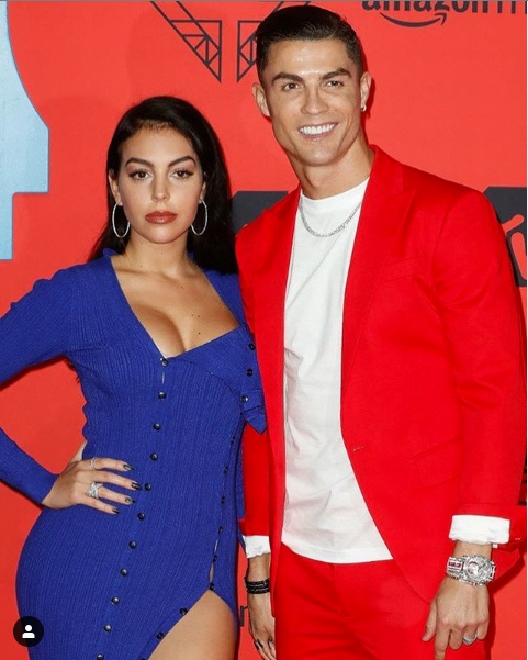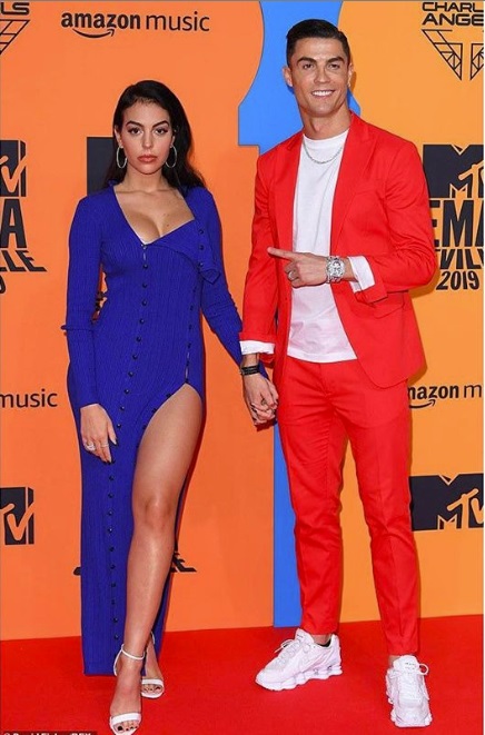 조지나는 자신의 섹시한 매력을 한껏 과시했다. 가슴이 깊게 파인 파란색 원피스를 입었고, 다리는 한 쪽을 노출시켰다. 호날두도 미소를 지으며 조지나를 가리키고 있다.