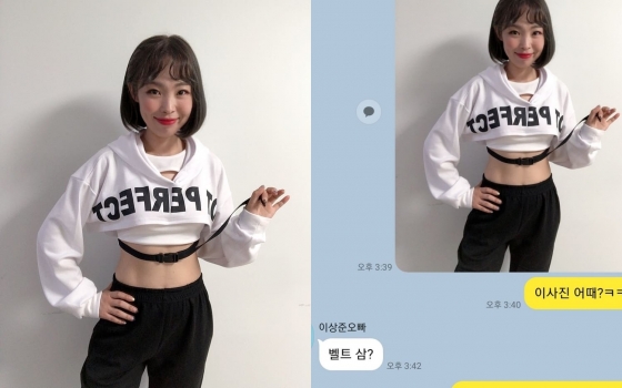 두 번째 사진은 개그맨 이상준에게 메신저로 본인의 사진을 보내고 받은 답장을 캡처한 것이다. 이상준은 오나미에게 "벨트 샀냐"라고 무심하게 답했다.
