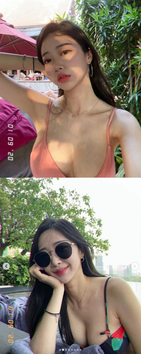 사진 속 신해리는 분홍색과 알록달록한 무늬의 비키니 수영복 차림으로 여유롭게 포즈를 취하고 있다.