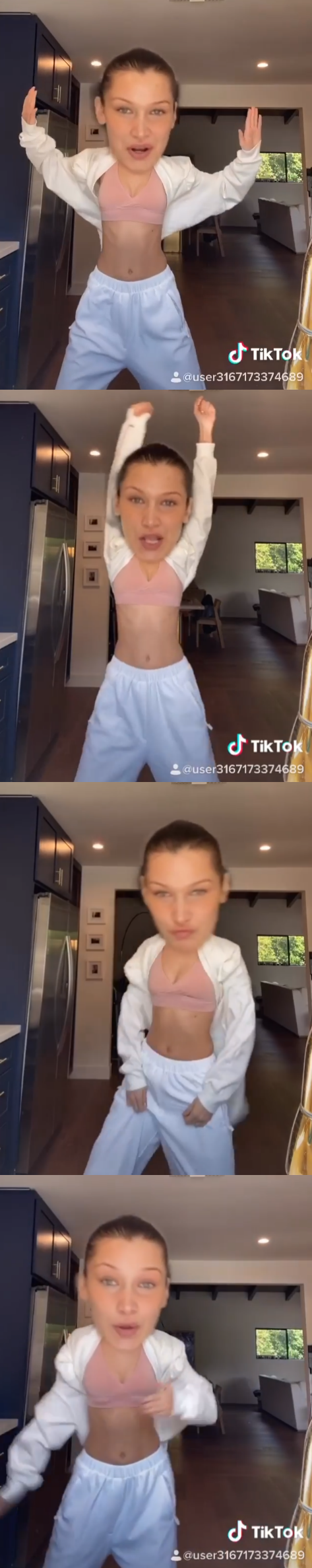 23일(현지시간) 벨라 하디드는 인스타그램 계정에 얼굴 부분이 크게 나오는 특수효과를 사용해, 코믹댄스를 추는 자신의 영상을 올렸다.