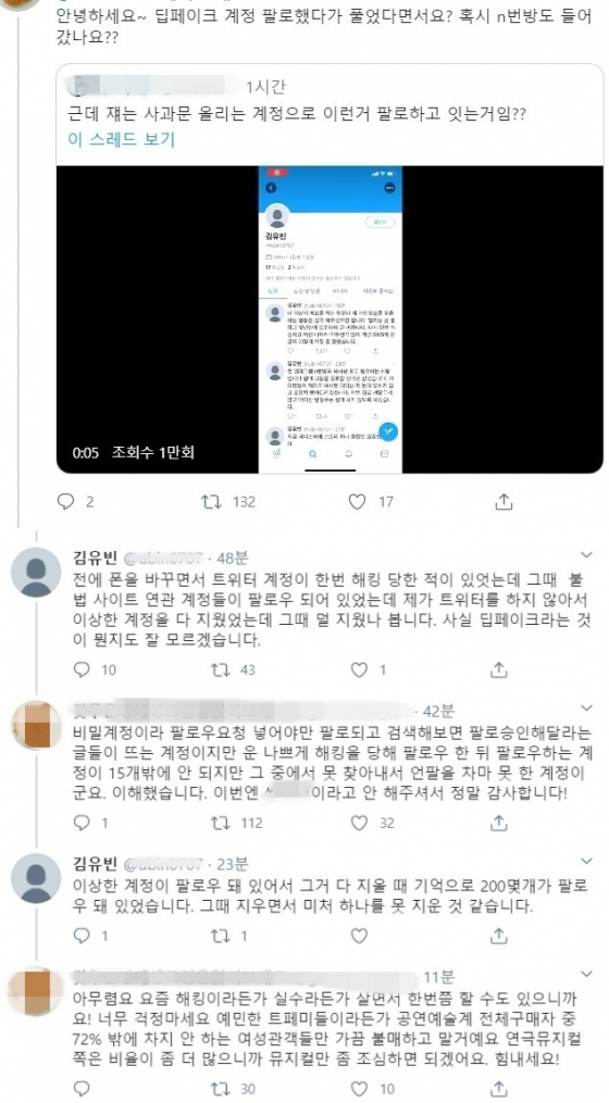 한 네티즌은 김유빈에게 "딥페이크 계정 팔로했다가 풀었다면서요? 혹시 N번방도 들어갔나요?"라고 물었다. 김유빈은 "전에 폰을 바꾸면서 트위터 계정이 한 번 해킹 당한 적이 있었는데 그대 불법 사이트 연관 계정들이 팔로우 되어 있었는데 제가 트위터를 하지 않아서 이상한 계정을 다 지웠는데 그때 덜 지웠나 봅니다. 사실 딥페이크라는 것이 뭔지도 잘 모르겠습니다"라고 답했다.