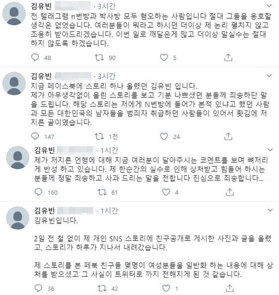 김유빈은 트위터를 통해 사과문을 게재했다. 그는 "지금 페이스북에 스토리 하나 올렸던 김유빈입니다. 제가 아무 생각없이 올린 스토리를 보고 기분 나쁘셨던 분들께 죄송하단 말을 드립니다. 해당 스토리는 저에게 N번방에 들어가 본 적 있냐고 했던 사람과 모든 대한민국의 남자들을 범죄자 취급하던 사람들이 있어서 홧김에 저지른 글이었습니다"라고 했다.