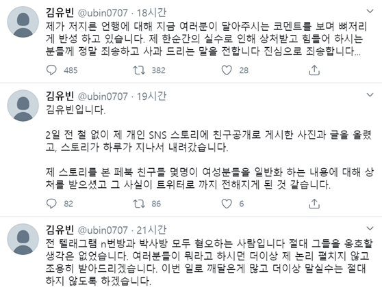 김유빈은 25일 "제가 아무 생각 없이 올린 스토리를 보고 기분 나쁘셨던 분들께 죄송하다는 말을 드린다. 해당 스토리는 제게 n번방에 들어가 본 적 있냐고 했던 사람과 모든 대한민국 남자들을 범죄자 취급하던 사람들이 있어서 홧김에 저지른 글이었다"라고 적었다. 이어 "저는 텔레그램 n번방과 박사방 모두 혐오하는 사람이다. 절대 그들을 옹호할 생각은 없었다. 여러분들이 뭐라고 하든 더이상 제 논리 펼치지 않고 조용히 받아들이겠다"라고 썼다. 이후에도 비판이 이어지자 김유빈은 또 한번 글을 쓰고 "제 스토리를 본 페이스북 친구들 몇명이 여성분들을 일반화하는 내용에 대해 상처를 받은 것 같다. 제가 저지른 언행에 대해 뼈저리게 반성하고 있다"라고 덧붙였다.
