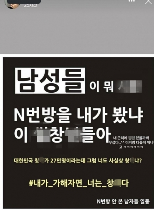 김유빈은 24일 자신의 페이스북 스토리에 n번방 사건을 언급했다. 그는 "남성들이 뭐 씨X. n번방을 내가 봤냐. 이 X창X들아. 대한민국 창X가 27만명이라는데 그럼 너도 사실상 창X냐. 내가 가해자면 너는 창X다. n번방 안 본 남자들 일동"이라는 글을 공유했다. 그는 "내 근처에 창X 있을까봐 무섭다. 이거랑 다를 게 뭐냐고"라는 자기 생각도 썼다.