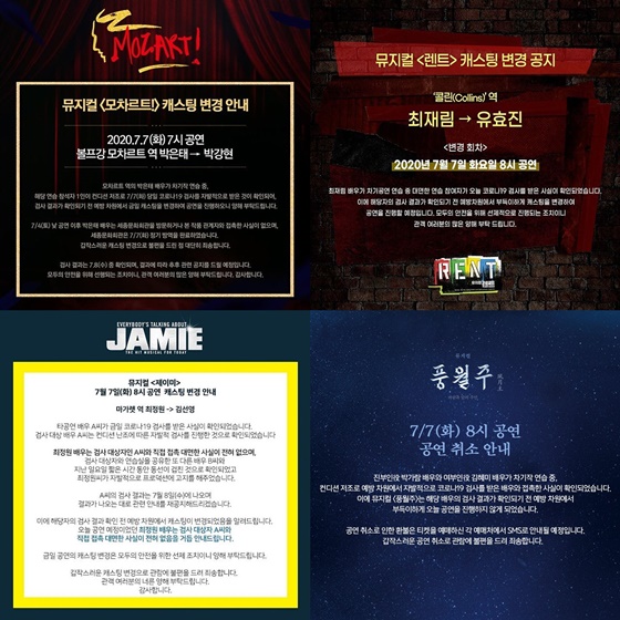 또한 "A씨의 검사 결과는 7월 8일에 나오며 결과가 나오는 대로 안내를 재공지해드리겠습니다. 이에 해당자의 검사 결과 확인 전 예방 차원에서 캐스팅이 변경되었음을 알려드립니다. 이날 공연 예정이었던 최정원 배우는 검사 대상자 A씨와 직접 접촉 대면한 사실이 전혀 없음을 거듭 안내드립니다. 금일 공연의 캐스팅 변경은 모두의 안전을 위한 선제 조치이니 양해 부탁드립니다. 갑작스러운 캐스팅 변경으로 관람에 불편을 드려 죄송합니다. 관객 여러분의 너른 양해 부탁드립니다"라고 설명했다.