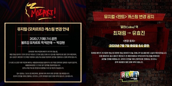 뮤지컬 '렌트' 제작사 신시컴퍼니 측도 SNS를 통해 "최재림 배우가 차기 공연 연습 중 대면한 연습 참여자가 코로나19 검사를 받은 사실이 확인되었습니다. 이에 해당자의 겸사 결과가 확인되기 전 예방차원에서 부득이하게 캐스팅을 변경하여 공연을 진행할 예정입니다. 모두의 안전을 위해 선제적으로 진행되는 조치이니 관객 여러분의 많은 양해 부탁드립니다"라고 전했다.
