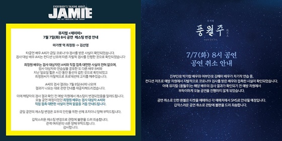 뮤지컬 '풍월주' 제작사 주식회사 랑은 SNS를 통해 공연 취소를 알렸다. 제작사 측은 "진부인 역의 박가람 배우와 여부인 역 김혜미 배우가 차기작 연습 중 컨디션 저조로 예방 차원에서 자발적으로 코로나19 검사를 받은 배우와 접촉한 사실이 확인되었습니다. 이에 뮤지컬 '풍월주'는 해당 배우의 검사 결과가 확인되기 전 예방 차원에서 부득이하게 공연을 진행하지 않게 되었습니다. 공연 취소로 인한 환불은 티켓을 예매하신 각 예매처에서 SMS로 안내될 예정입니다. 갑작스러운 공연 취소로 관람에 불편을 드려 죄송합니다"라고 했다. 뿐만 아니라 뮤지컬 '브로드웨이 42번가'에 출연하는 배우 김환희의 캐스팅도 변경됐다.