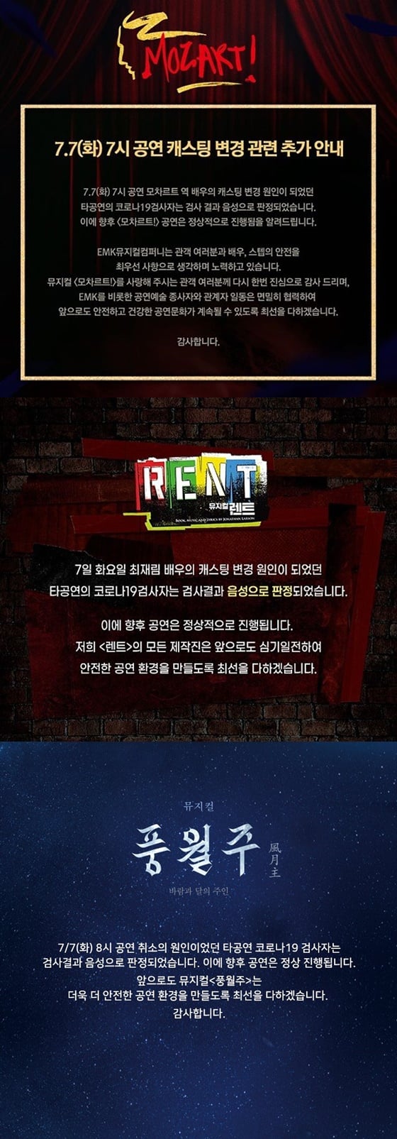 8일 뮤지컬 '모차르트' 제작사 EMK컴퍼니 측은 공식 SNS에 "7월 7일 7시 공연 모차르트 역 배우의 캐스팅 변경 원인이 되었던 타 공연의 코로나19 검사자는 검사 결과 음성으로 판정되었습니다. 이에 향후 '모차르트!' 공연은 정상적으로 진행됨을 알려드립니다"라고 적었다.