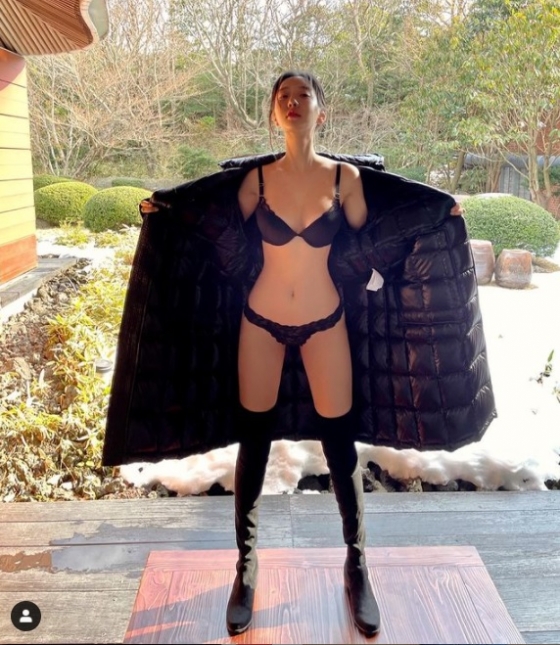 신재은은 최근 자신의 인스타그램에 "패딩 안에 속옷만 입기 가능?"이라는 글과 함께 한 장의 사진을 게시했다. 사진 속 신재은은 검정색 속옷만 입은 채 부츠와 롱패딩을 걸치고 있다.