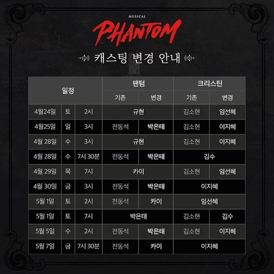 뮤지컬 <팬텀> 캐스팅 변경 안내