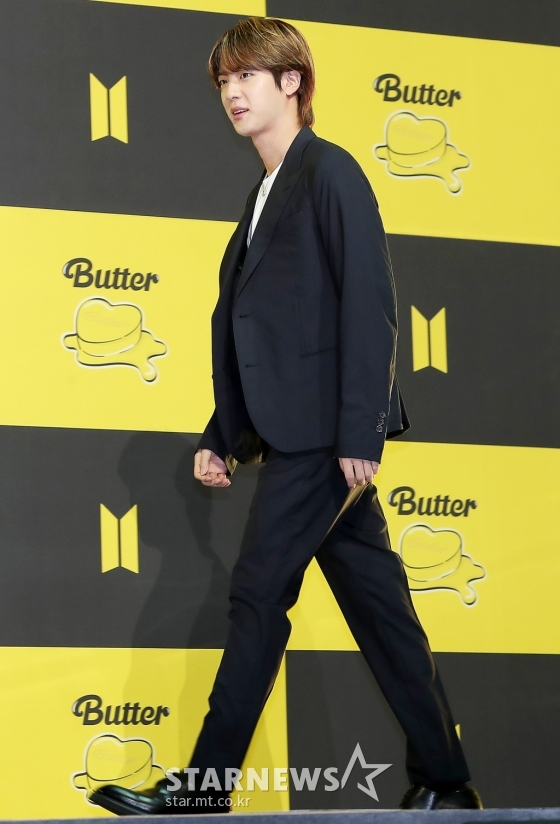 방탄소년단(BTS) 진이 21일 오후 서울 송파구 방이동 올림픽홀에서 진행된 새 싱글앨범 'Butter' 발매 기념 쇼케이스에 참석하고 있다.