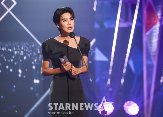 개그우먼 장도연이 10일 오후 비대면 녹화 방송으로 진행된 제48회 한국방송대상 시상식에서 진행자상을 수상한 뒤 소감을 밝히고 있다.