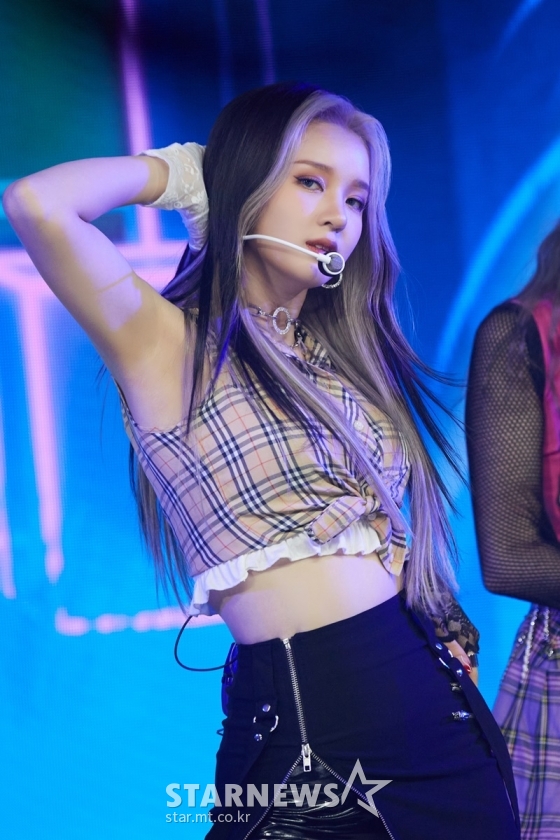 걸그룹 핫이슈(HOT ISSUE) 형신이 29일 오후 온라인 생중계로 진행된 새 앨범 'ICONS' 발매기념 쇼케이스에서 신곡을 선보이고 있다.