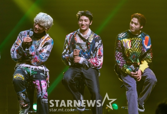 그룹 블리처스(BLITZERS)가 6일 오후 온라인 생중계로 진행된 두 번째 EP '싯-벨트'(SEAT-BELT) 발매기념 쇼케이스에서 질문에 답하고 있다.