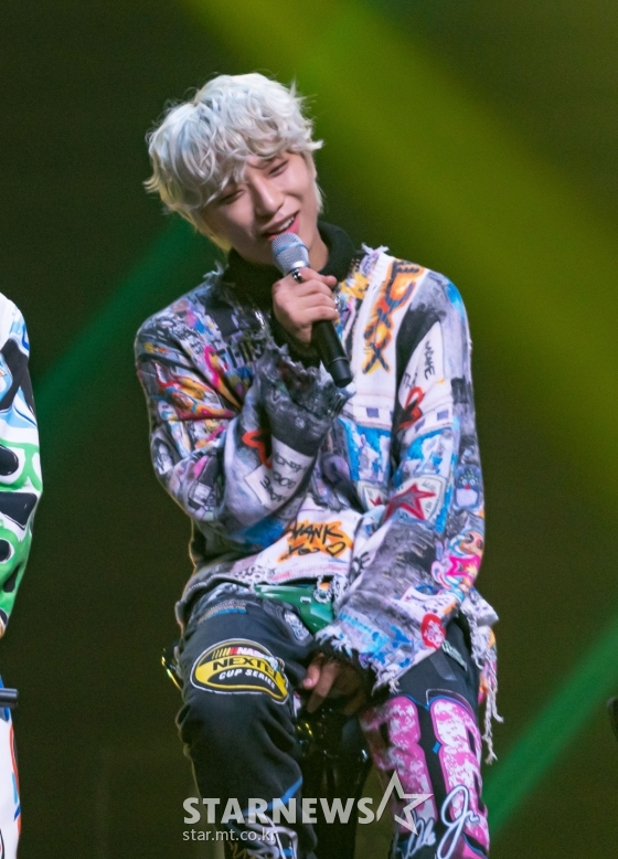 그룹 블리처스(BLITZERS) 우주가 6일 오후 온라인 생중계로 진행된 두 번째 EP '싯-벨트'(SEAT-BELT) 발매기념 쇼케이스에서 질문에 답하고 있다.