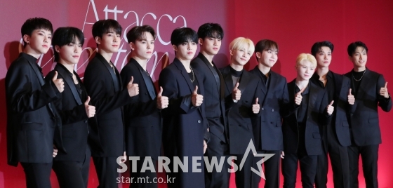 그룹 세븐틴이 22일 오전 서울 영등포구 여의도 콘래드 호텔에서 진행된 미니 9집 'Attacca'(아타카) 발매 기념 쇼케이스에 참석해 포즈를 취하고 있다.