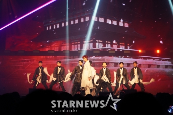 그룹 원어스(ONEUS)가 7일 오후 온라인 생중계로 진행된 단독 콘서트 'ONEUS THEATRE : 적월도'에서 신곡을 선보이고 있다.