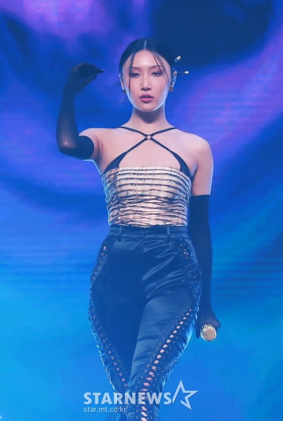 걸그룹 마마무 화사가 24일 오후 서울 광진구 예스24 라이브홀에서 진행된 두 번째 싱글 앨범 '길티 플레저'(Guilty Pleasure) 발매기념 쇼케이스에서 신곡을 선보이고 있다.