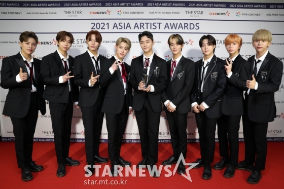그룹 T1419가 2일 오후 서울 강서구 KBS아레나에서 진행된 '2021 Asia Artist Awards(2021 아시아 아티스트 어워즈, 2021 AAA)' 시상식에서 AAA포텐셜 가수부문상을 수상하고 포즈를 취하고 있다.