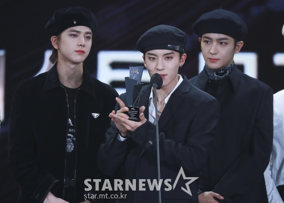 그룹 더보이즈가 2일 오후 서울 강서구 등촌동 KBS 아레나에서 열린 2021 Asia Artist Awards (2021 아시아 아티스트 어워즈, 2021 AAA) 시상식에서 AAA 베스트 뮤지션상을 수상하고 소감을 전하고 있다.