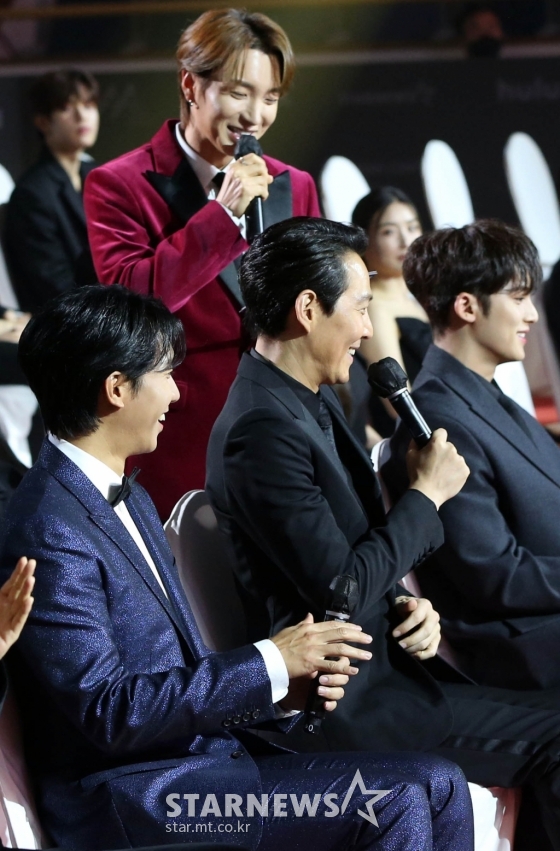 이특과 이정재, 이승기가 2일 오후 서울 강서구 KBS아레나에서 진행된 '2021 Asia Artist Awards(2021 아시아 아티스트 어워즈, 2021 AAA)' 시상식에서 객석 인터뷰를 진행하고 있다.