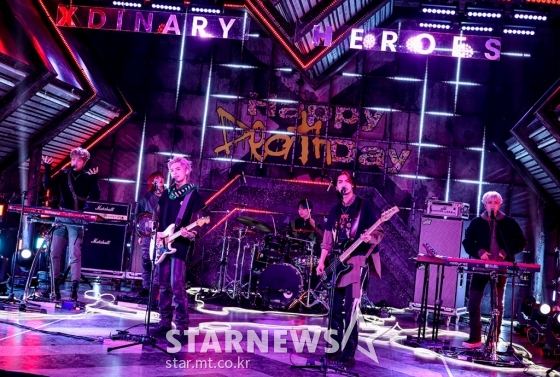 JYP의 신인 밴드 엑스디너리 히어로즈(Xdinary Heroes, XH) 오드가 6일 오후 온라인 생중계로 진행된 첫 번째 디지털 싱글 '해피 데스 데이'(Happy Death Day) 발매기념 쇼케이스에서 신곡을 선보이고 있다.