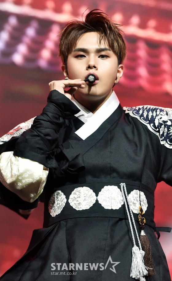 그룹 킹덤(KINGDOM) 자한이 31일 오후 온라인 생중계로 진행된 미니 4집 '히스토리 오브 킹덤 : 파트 4. 단' 발매기념 쇼케이스에서 신곡을 선보이고 있다.