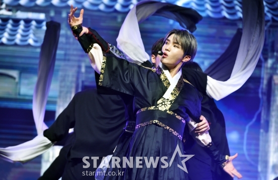 그룹 킹덤(KINGDOM) 자한이 31일 오후 온라인 생중계로 진행된 미니 4집 '히스토리 오브 킹덤 : 파트 4. 단' 발매기념 쇼케이스에서 신곡을 선보이고 있다.