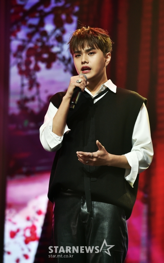 그룹 킹덤(KINGDOM) 자한이 31일 오후 온라인 생중계로 진행된 미니 4집 '히스토리 오브 킹덤 : 파트 4. 단' 발매기념 쇼케이스에서 신곡을 선보이고 있다.