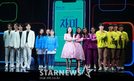 배우 유주혜, 이아진, 홍나현, 이봄소리, 정우연, 홍서영, 이채민, 박영수, 고상호, 진태화, 차서원, 조풍래, 기세중, 안지환, 황순종이 28일 오후 서울 종로구 동숭동 플러스씨어터에서 진행된 뮤지컬 '차미' 프레스콜에서 포즈를 취하고 있다. '차미'는 SNS의 폐해를 주제로 주인공 미호가 Cha_Me가 아닌 진정한 차미호를 찾아가는 여정을 그린 뮤지컬이다. /2022.04.28