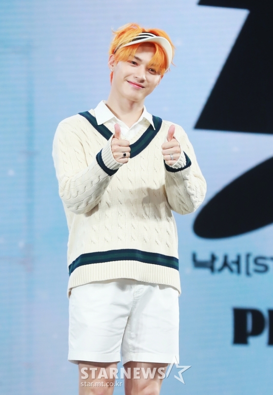 그룹 오메가엑스(OMEGA X) 한겸이 15일 오후 서울 광진구 예스24라이브홀에서 진행된 정규 1집 '낙서 : 스토리 리튼 인 뮤직'(樂서 : Story Written in Music) 발매기념 쇼케이스에서 포즈를 취하고 있다.