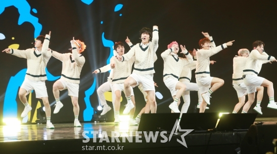 그룹 오메가엑스(OMEGA X)가 15일 오후 서울 광진구 예스24라이브홀에서 진행된 정규 1집 '낙서 : 스토리 리튼 인 뮤직'(樂서 : Story Written in Music) 발매기념 쇼케이스에서 신곡을 선보이고 있다.