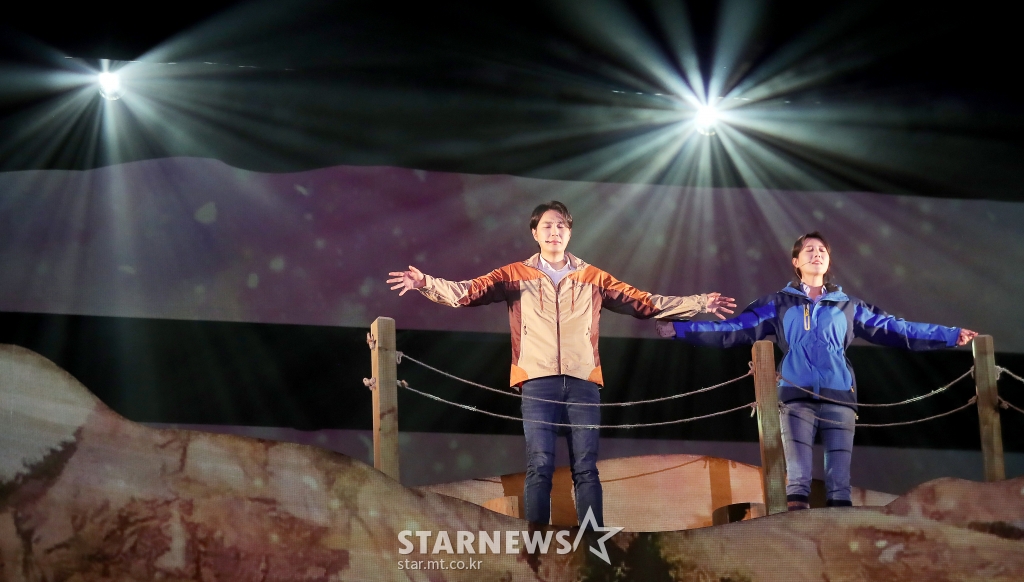 뮤지컬배우 조성윤, 고은영이 30일 오후 서울 종로구 홍익대 대학로 아트센터 대극장에서 진행된 뮤지컬 '번지점프를 하다' 프레스콜에 참석해 열연하고 있다.