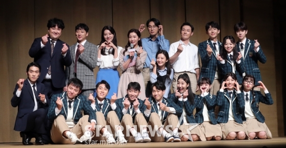 30일 오후 서울 종로구 홍익대 대학로 아트센터 대극장에서 뮤지컬 '번지점프를 하다' 프레스콜에 참석한 출연 배우들이 포즈를 취하고 있다.