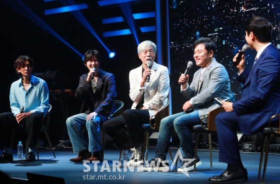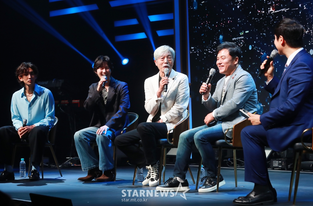 1980년대 대표 록밴드 '송골매'의 배철수, 구창모가 6일 오후 서울 마포구 메세나폴리스 신한플레이 스퀘어에서 진행된 '2022 송골매 전국투어 콘서트 : 열망' 기자간담회에서 후배가수 최종훈, 수호 등과 함께 질문에 답하고 있다.
