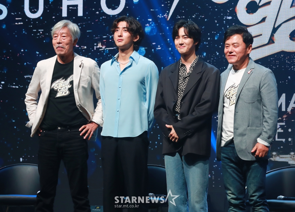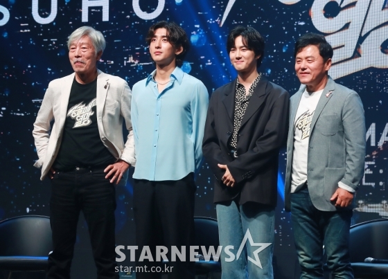 1980년대 대표 록밴드 '송골매'의 배철수, 구창모가 6일 오후 서울 마포구 메세나폴리스 신한플레이 스퀘어에서 진행된 '2022 송골매 전국투어 콘서트 : 열망' 기자간담회에서 리메이크에 참여한 엑소 수호, 잔나비 최정훈과 함꼐 포즈를 취하고 있다.