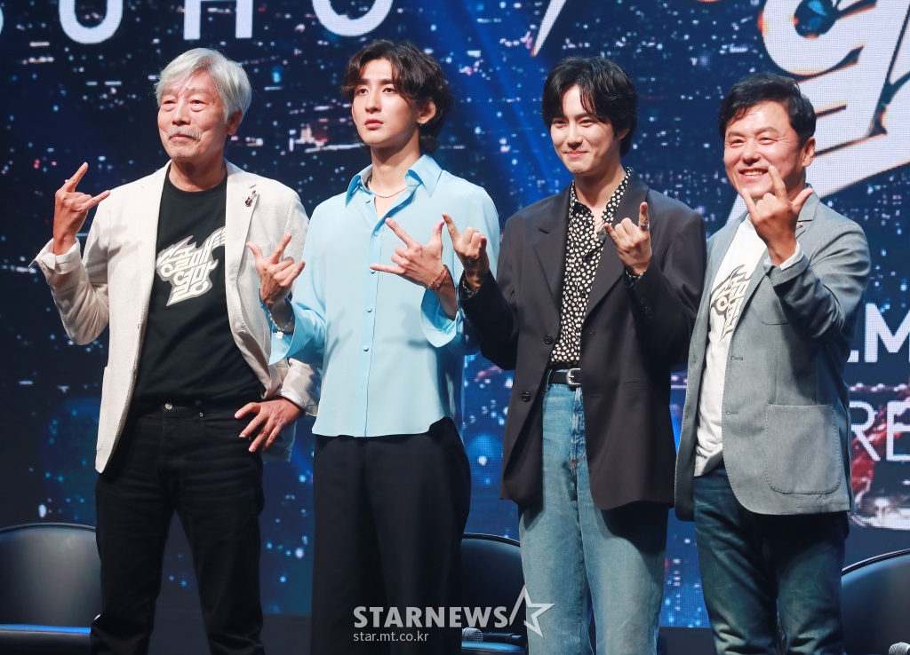 1980년대 대표 록밴드 '송골매'의 배철수, 구창모가 6일 오후 서울 마포구 메세나폴리스 신한플레이 스퀘어에서 진행된 '2022 송골매 전국투어 콘서트 : 열망' 기자간담회에서 리메이크에 참여한 엑소 수호, 잔나비 최정훈과 함꼐 포즈를 취하고 있다.