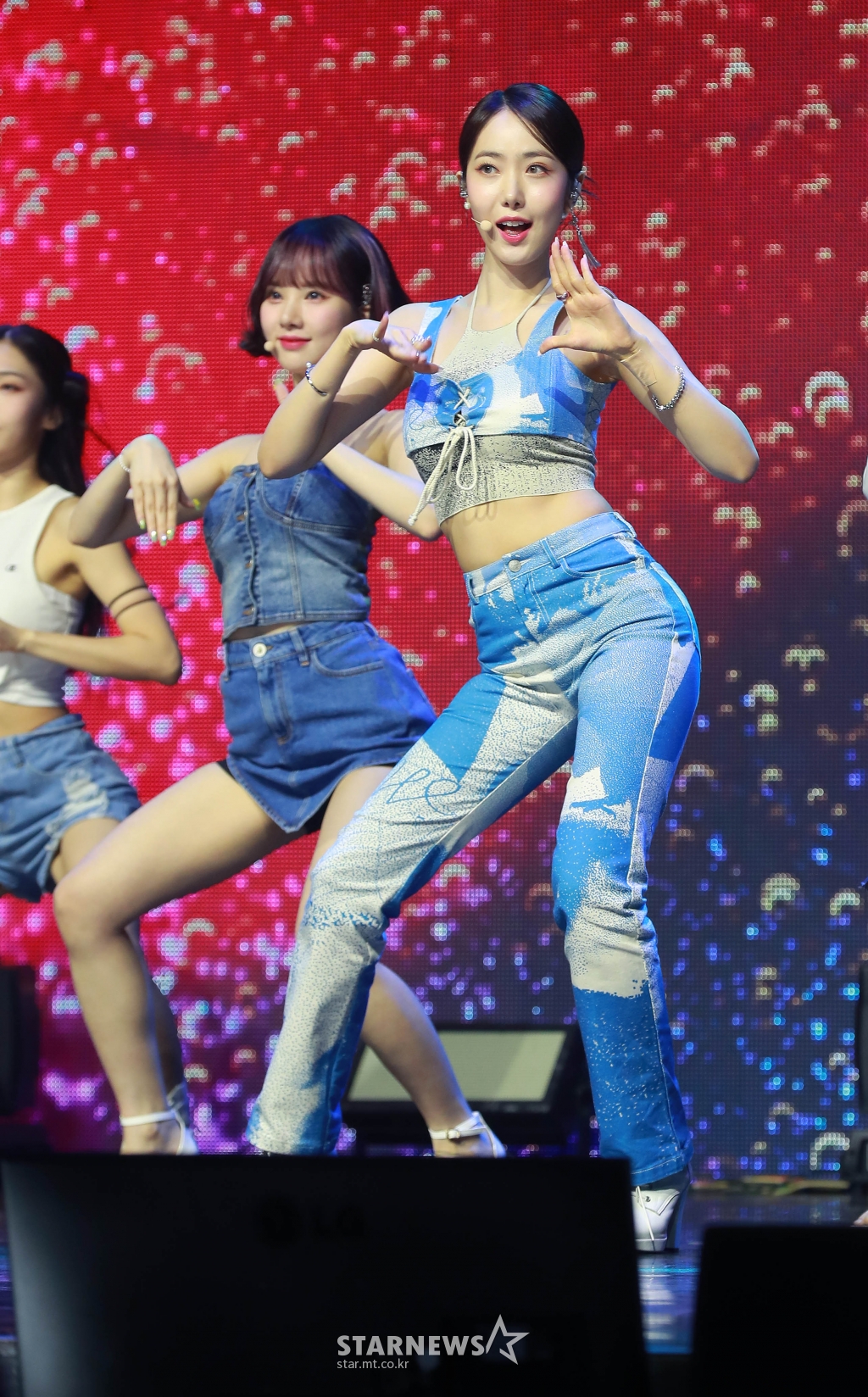 걸그룹 비비지(VIVIZ)가 6일 오후 서울 광진구 예스24라이브홀에서 진행된 두 번째 미니앨범 ‘Summer Vibe'(서머 바이브) 발매기념 쇼케이스에서 신곡을 선보이고 있다.