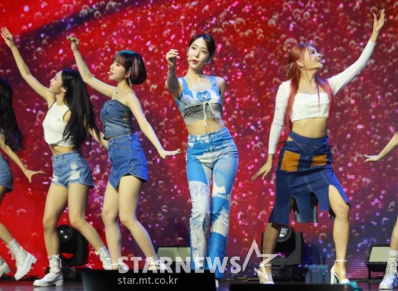 걸그룹 비비지(VIVIZ)가 6일 오후 서울 광진구 예스24라이브홀에서 진행된 두 번째 미니앨범 ‘Summer Vibe'(서머 바이브) 발매기념 쇼케이스에서 신곡을 선보이고 있다.