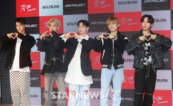 그룹 APR PROJECT와 피처링을 맡은 TRCNG 전 멤버 호현이 7일 오후 서울 강남구 바나나홀에서 진행된 새 싱글 'BOYHOOD I S#2' 발매기념 쇼케이스에 참석해 포즈를 취하고 있다.