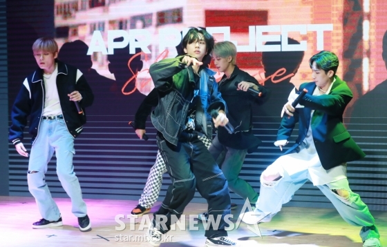 그룹 APR PROJECT와 피처링을 맡은 TRCNG 전 멤버 호현이 7일 오후 서울 강남구 바나나홀에서 진행된 새 싱글 'BOYHOOD I S#2' 발매기념 쇼케이스에 참석해 신곡을 선보이고 있다.