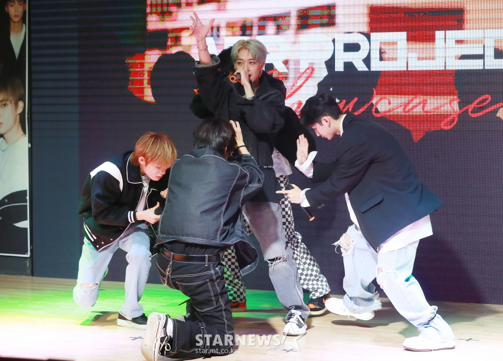 그룹 APR PROJECT와 피처링을 맡은 TRCNG 전 멤버 호현이 7일 오후 서울 강남구 바나나홀에서 진행된 새 싱글 'BOYHOOD I S#2' 발매기념 쇼케이스에 참석해 신곡을 선보이고 있다.