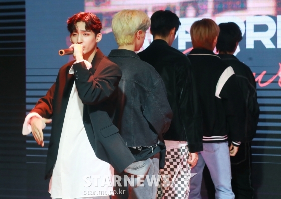 그룹 APR PROJECT와 피처링을 맡은 TRCNG 전 멤버 호현이 7일 오후 서울 강남구 바나나홀에서 진행된 새 싱글 'BOYHOOD I S#2' 발매기념 쇼케이스에 참석해 신곡을 선보이고 있다.
