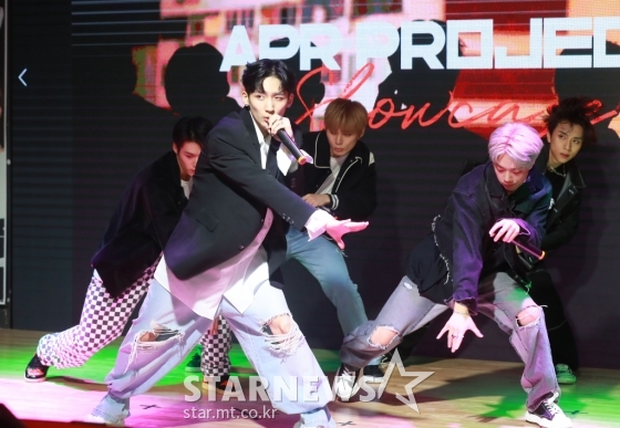 그룹 APR PROJECT와 피처링을 맡은 TRCNG 전 멤버 호현이 7일 오후 서울 강남구 바나나홀에서 진행된 새 싱글 'BOYHOOD I S#2' 발매기념 쇼케이스에 참석해 신곡을 선보이고 있다.