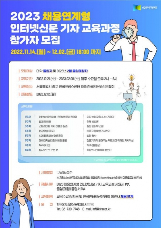 10일 한국인터넷신문협회(회장 이의춘) 산하 KINA교육센터(센터장 김창영, 협회 이사)는'2023 채용연계형 인터넷신문 기자 교육과정'참가자를 모집한다고 밝혔다.