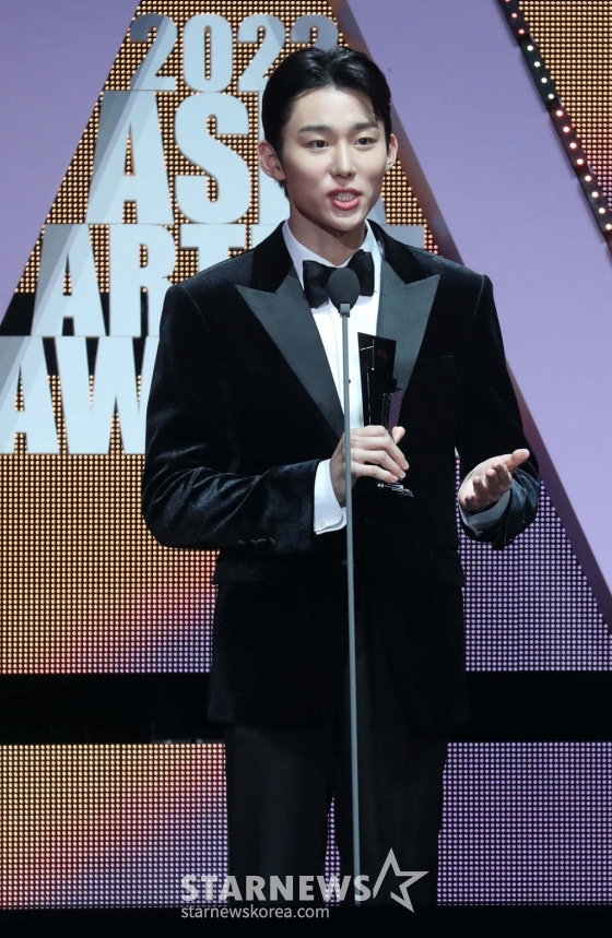 배우 서범준이 13일 오후 일본 나고야 니혼가이시홀에서 열린 스타뉴스-미디어보이 주최 '2022 Asia Artist Awards IN JAPAN'(2022 아시아 아티스트 어워즈, 이하 2022 AAA)에서 AAA신인상을 수상하고 소감을 말하고 있다.