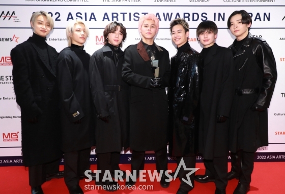 일본그룹 비퍼스트가 13일 오후 일본 나고야 니혼가이시홀에서 열린 스타뉴스-미디어보이 주최 '2022 Asia Artist Awards IN JAPAN'(2022 아시아 아티스트 어워즈, 이하 2022 AAA)에서 AAA 아시아 셀러브리티상을 수상한 뒤 포즈를 취하고 있다.